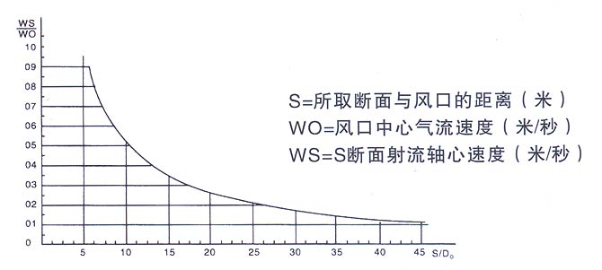 球形可調風口共有10種規格,可根據所需風量大小進行選用,風口局部阻力系數ξ=1.2.射流軸心速變化見曲線圖一。風口在不同風速下的風量見表一。